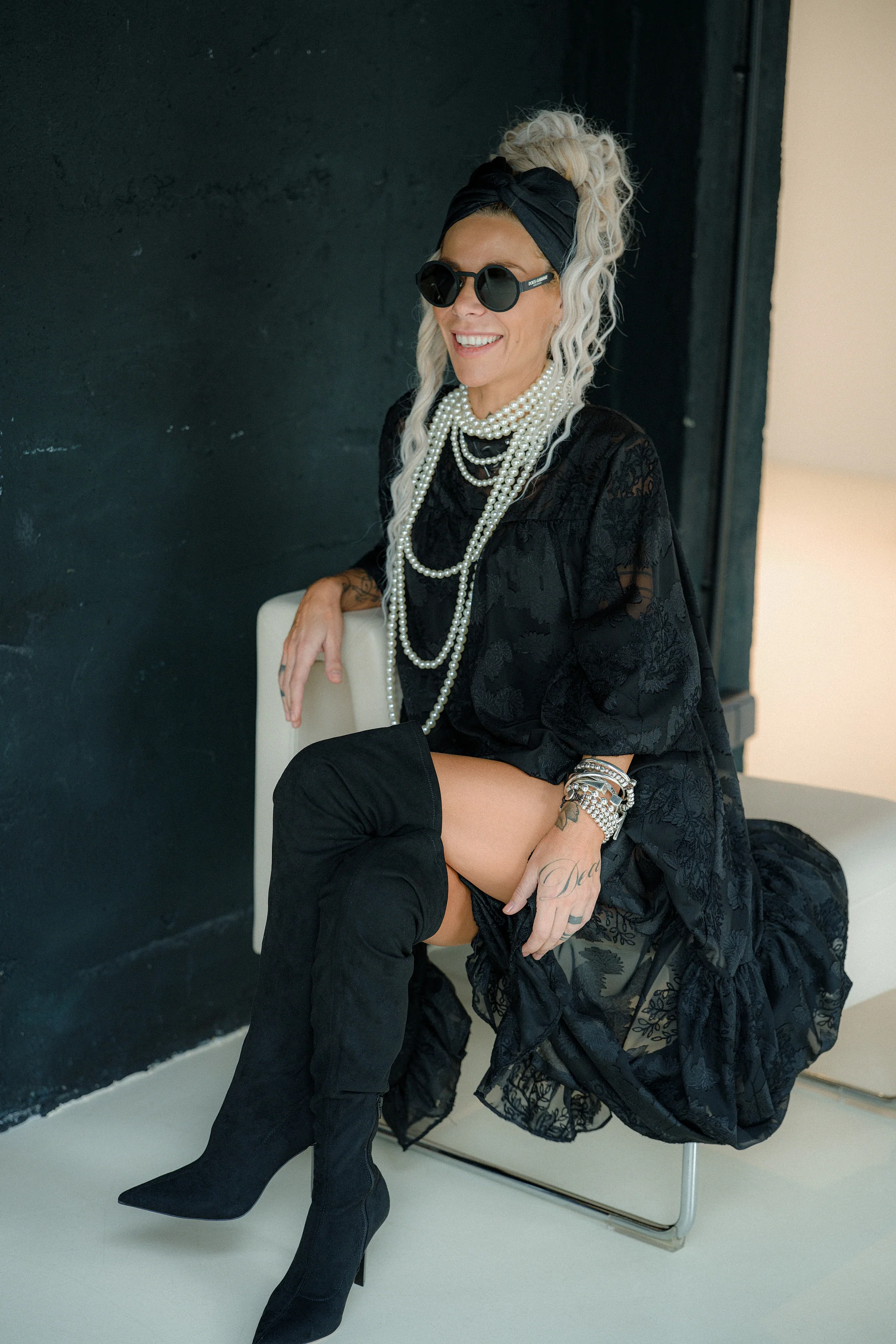 Layer over a fitted slip dress for an elegant, ethereal look, or contrast it with structured boots for a sharper, urban direction. Add statement jewelry to amplify the texture, or keep it stripped back for a clean monochrome silhouette. This dress shifts easily between elevated daytime wear and strong evening styling depending on how you choose to anchor it.