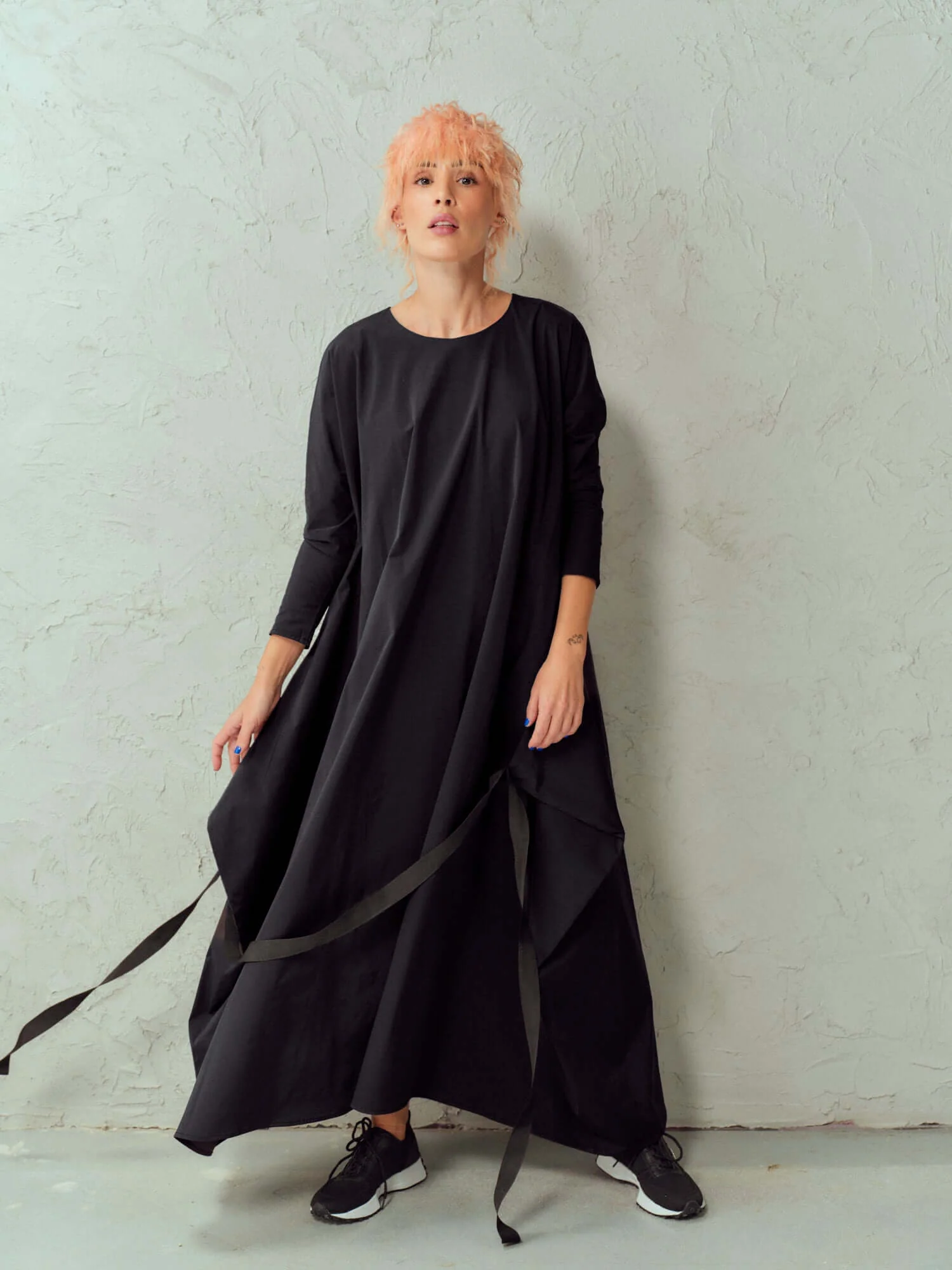 Maxi black dress with an adjustable strap that can be tied in multiple ways. Please note that this piece does not have pockets.