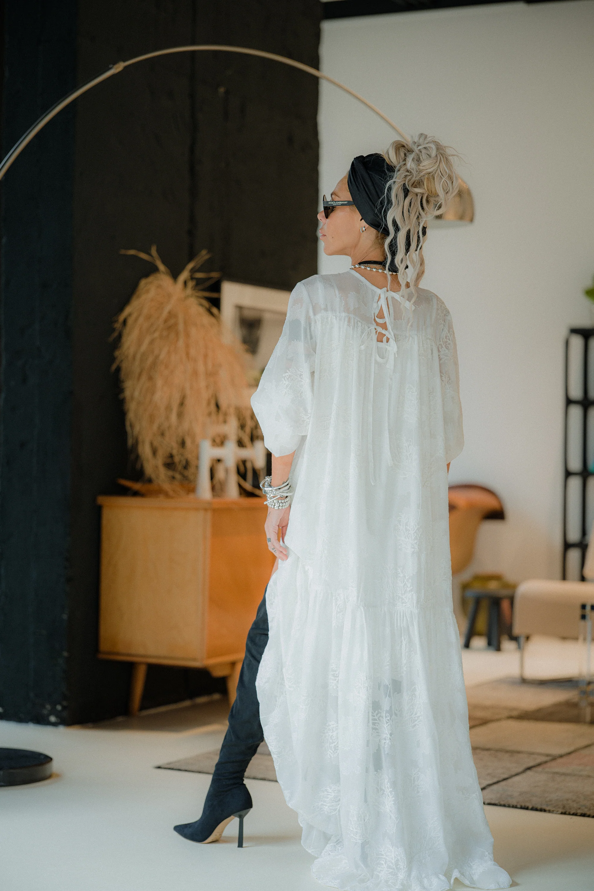 Layer over a fitted slip dress for an elegant, ethereal look, or contrast it with structured boots for a sharper, urban direction. Add statement jewelry to amplify the texture, or keep it stripped back for a clean monochrome silhouette. This dress shifts easily between elevated daytime wear and strong evening styling depending on how you choose to anchor it.