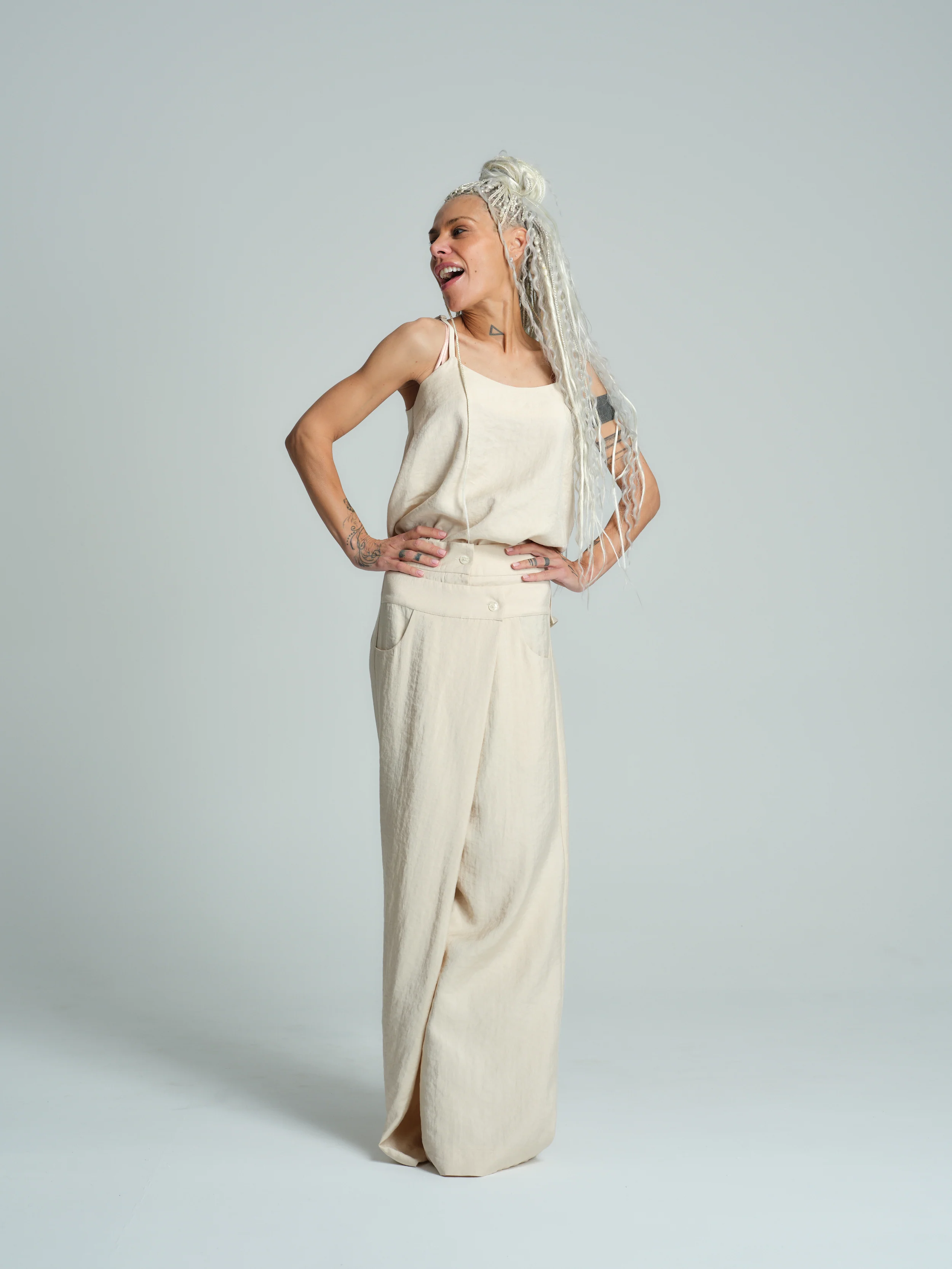 A two-piece set featuring a relaxed tank top and high-waisted pants with a double waist design, complete with functional pockets.